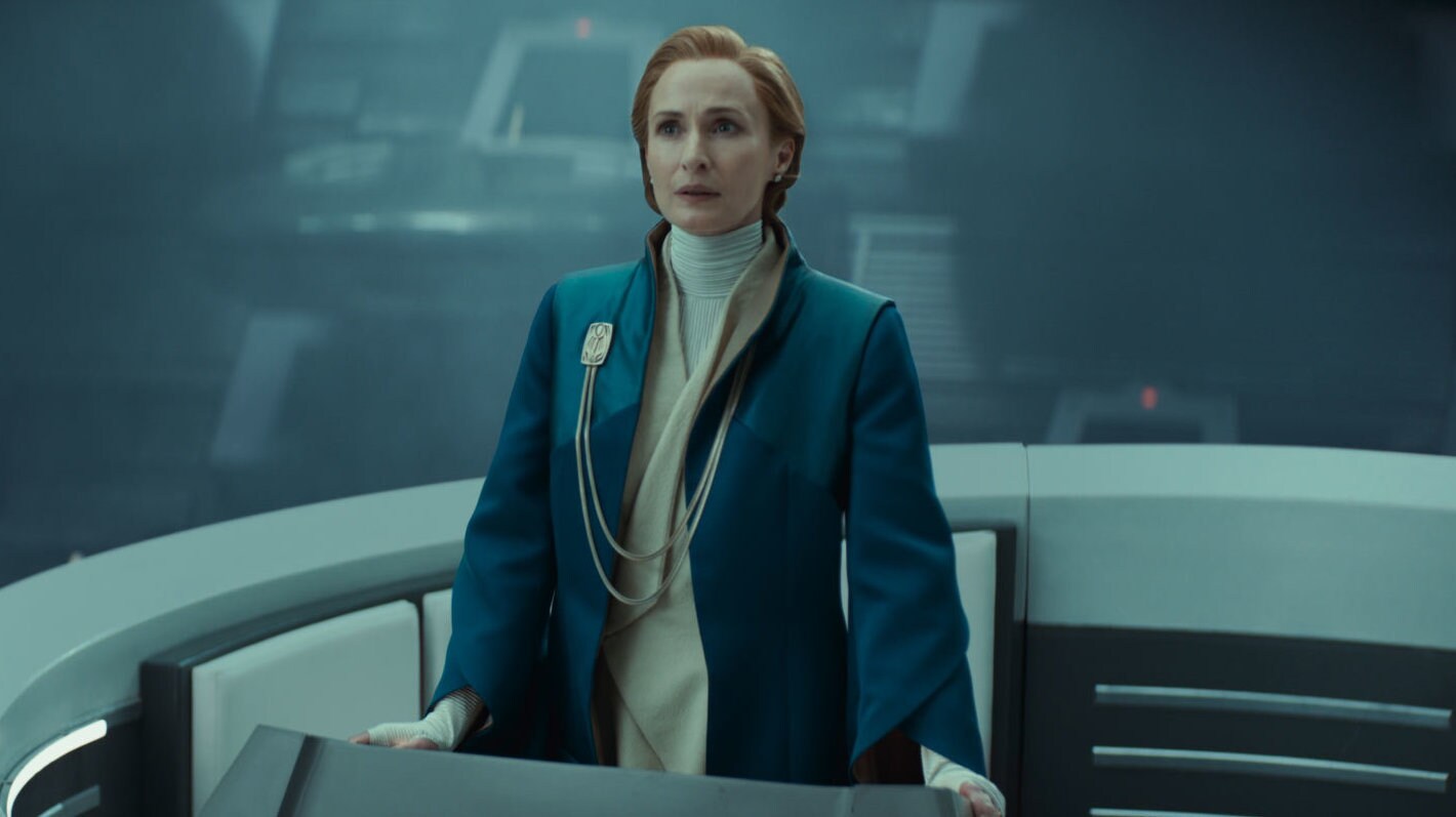 But no matter how much glory awaits Dedra, things on Ghorman only get worse for her. In episode 7, Partagaz effectively subordinates her to Captain Kaido, whose deployment of undisciplined grunts clearly disgusts Dedra. Then in episode 8, she’s caught off guard by the Empire’s prepositioning of mining equipment and stunned by Partagaz’s dismissal of her concerns. Her lack of control over Kaido (“I’m the trigger, Supervisor. You’re the finger. Make sure you’re available.”) clearly adds to her growing feelings of unease and helplessness. Later, as the massacre ends, Dedra suffers a full-blown panic attack, clawing at her collar for air and tugging vigorously at her tunic as if seeking comfort in a familiar habit.